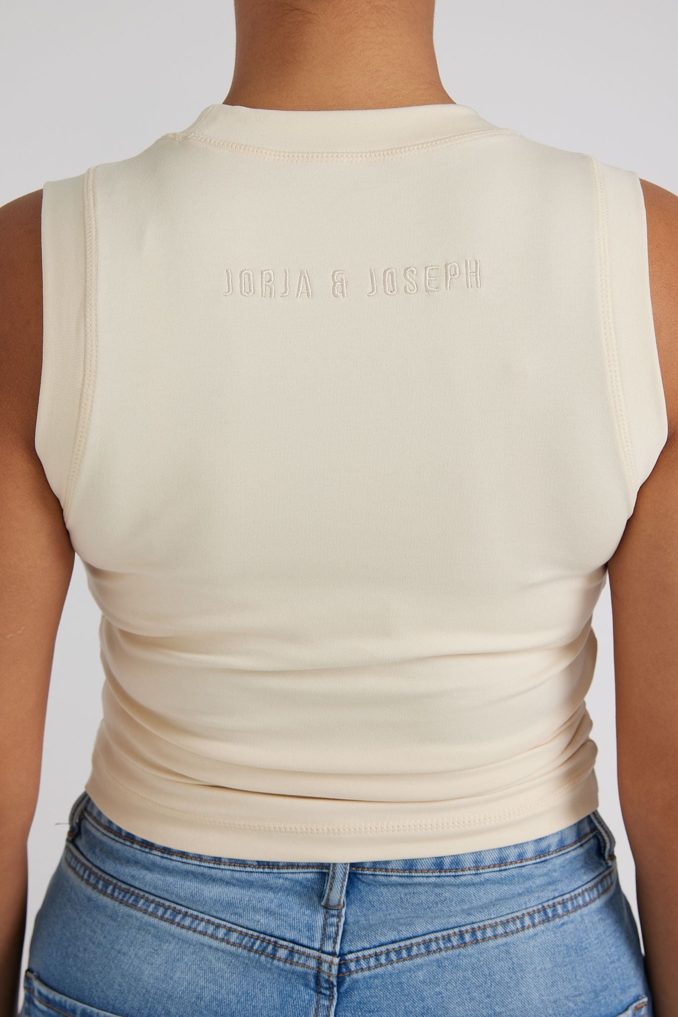 The Tank features 'JORJA & JOSEPH' tonal embroidery on the back. Designed for ultimate comfort and versatile styling, it pairs effortlessly with your favorite separates. Available in white, black, and cream—a cherished addition to any wardrobe.