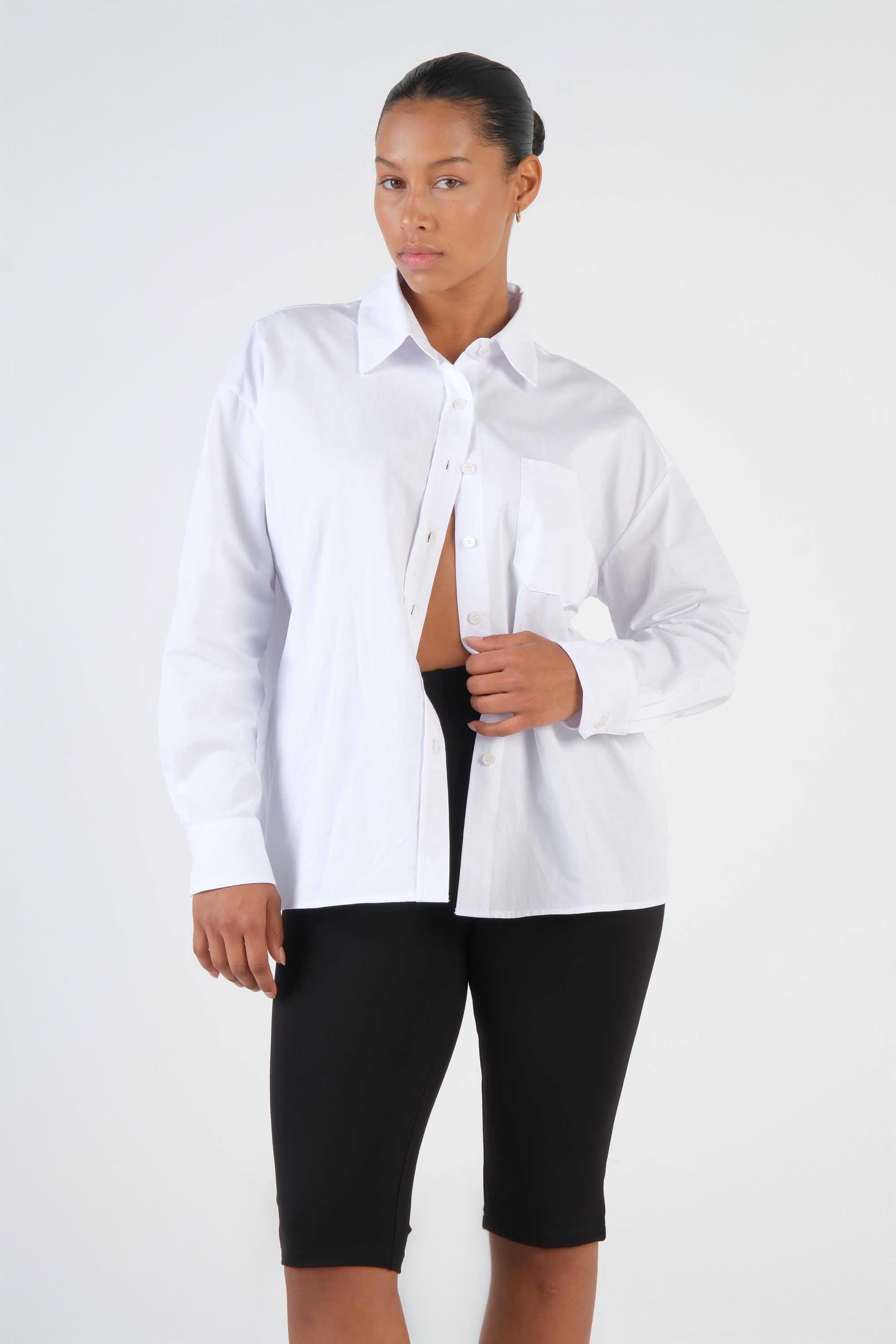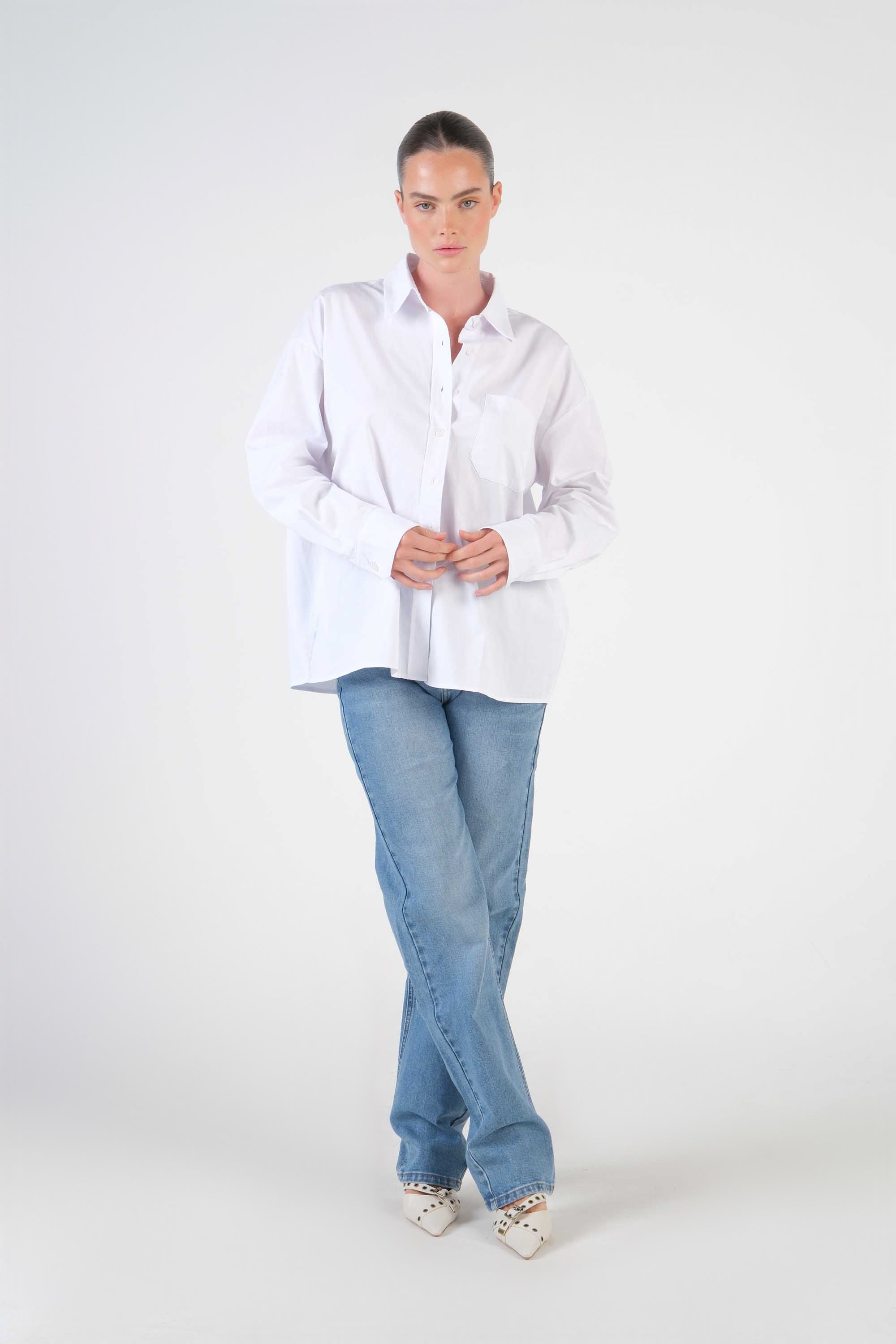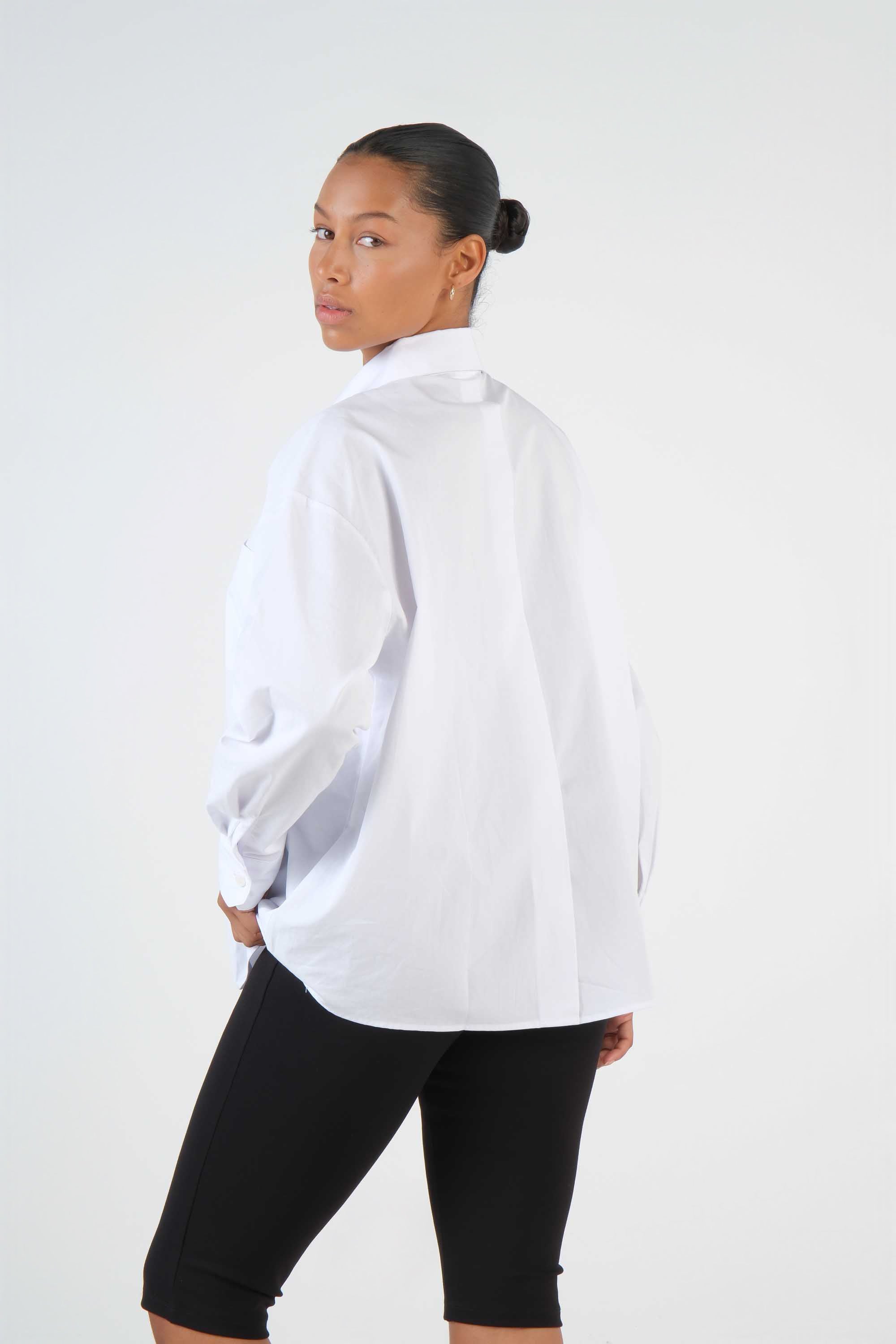 This 100% cotton shirt features an oversized cut, a pocket on the chest and a pointed collar; the long sleeves complete the classic tailored look.