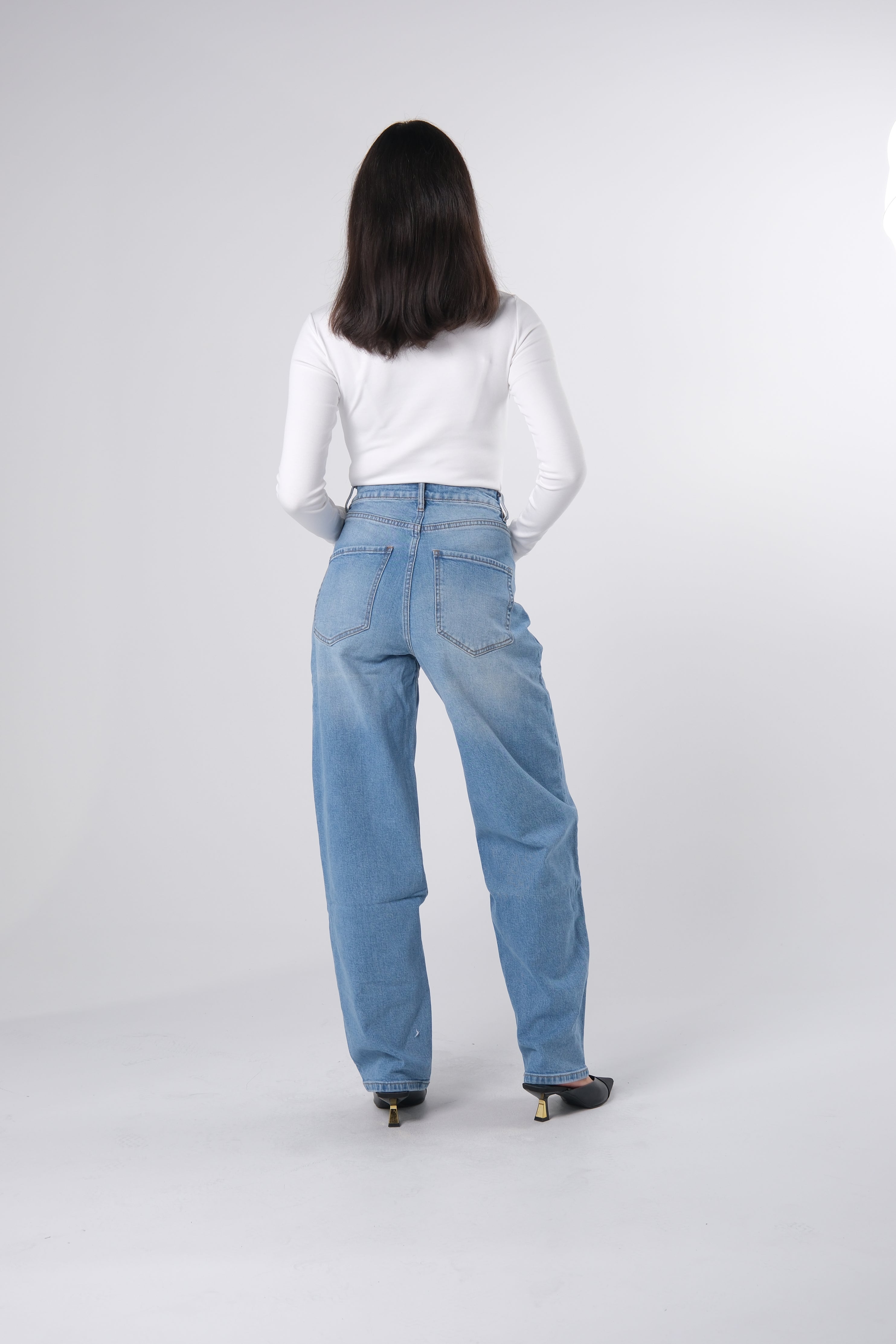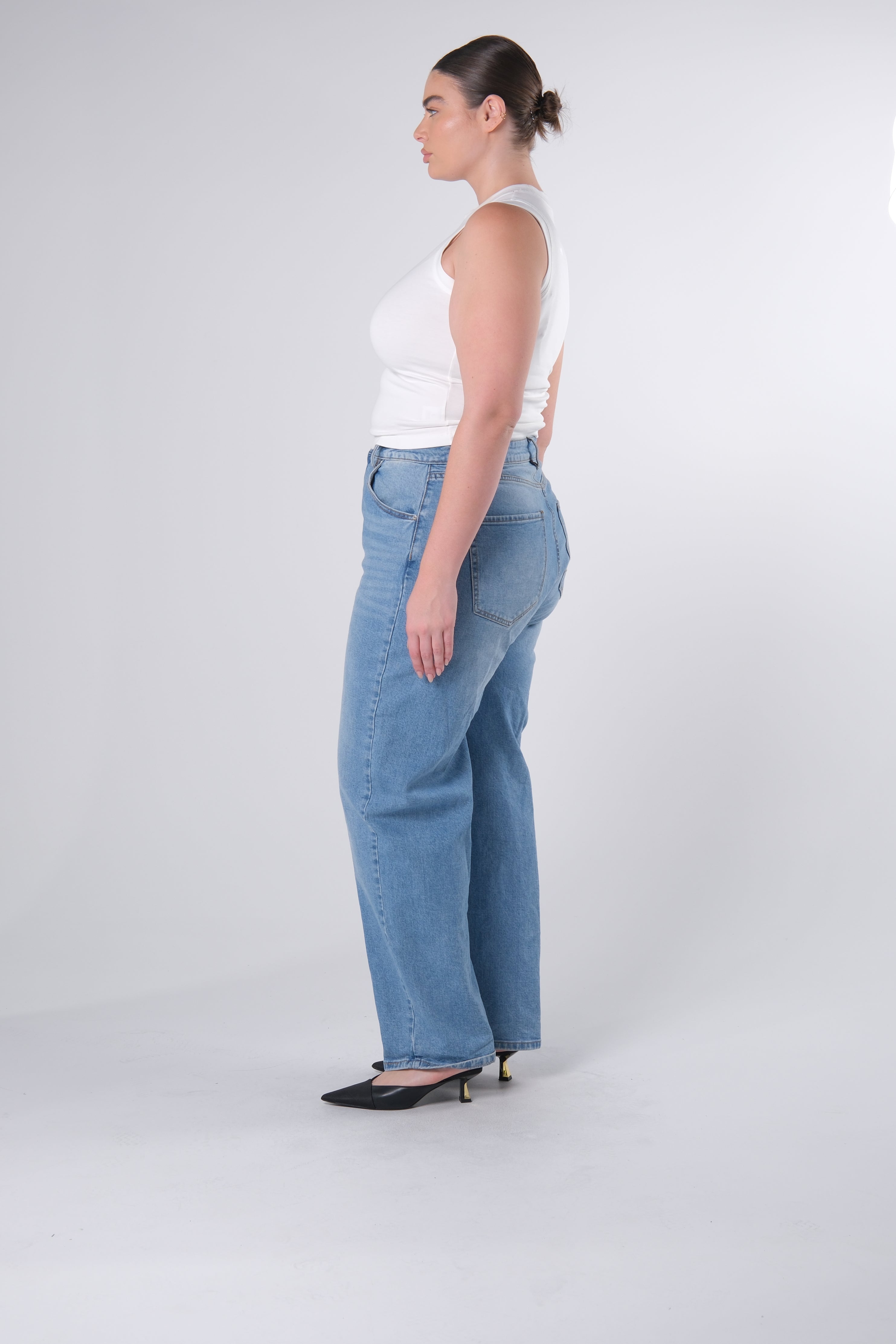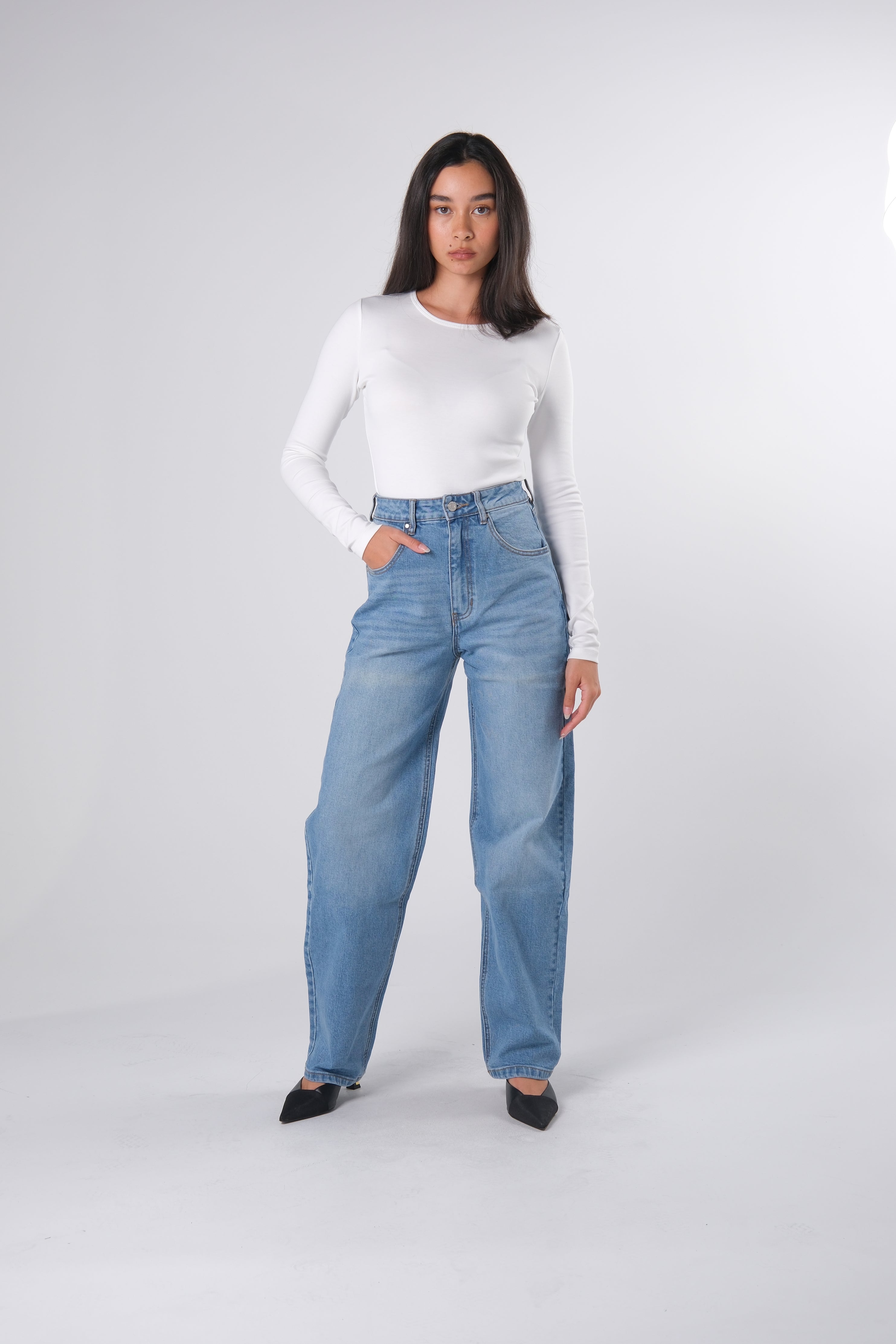 Designed to sit at mid-to-high hip, these jeans offer a snug waist and extra roomy leg for ultimate comfort. Available in medium blue wash, the baggy fit and classic details create a versatile look. For a low to mid-rise fit, size up.