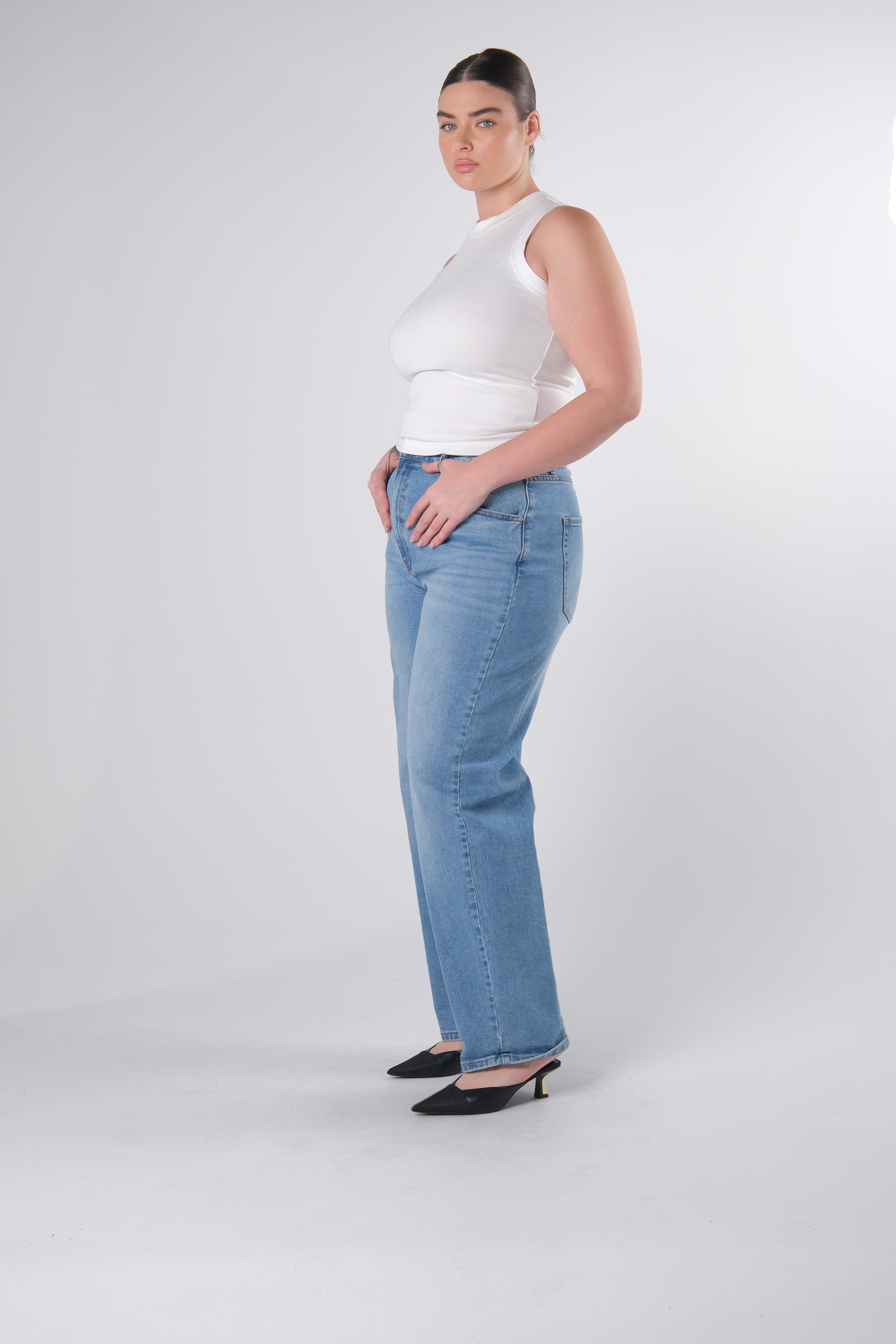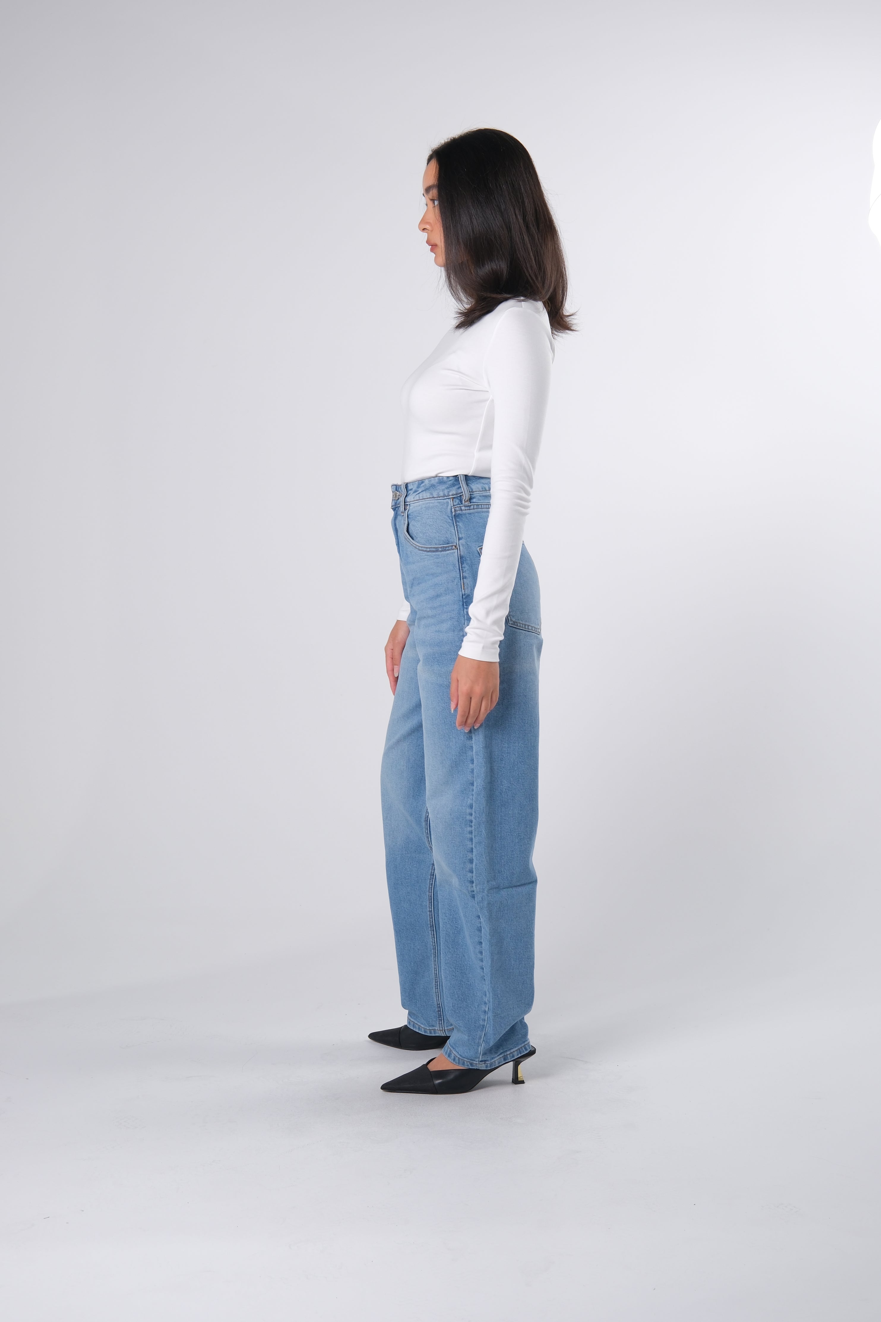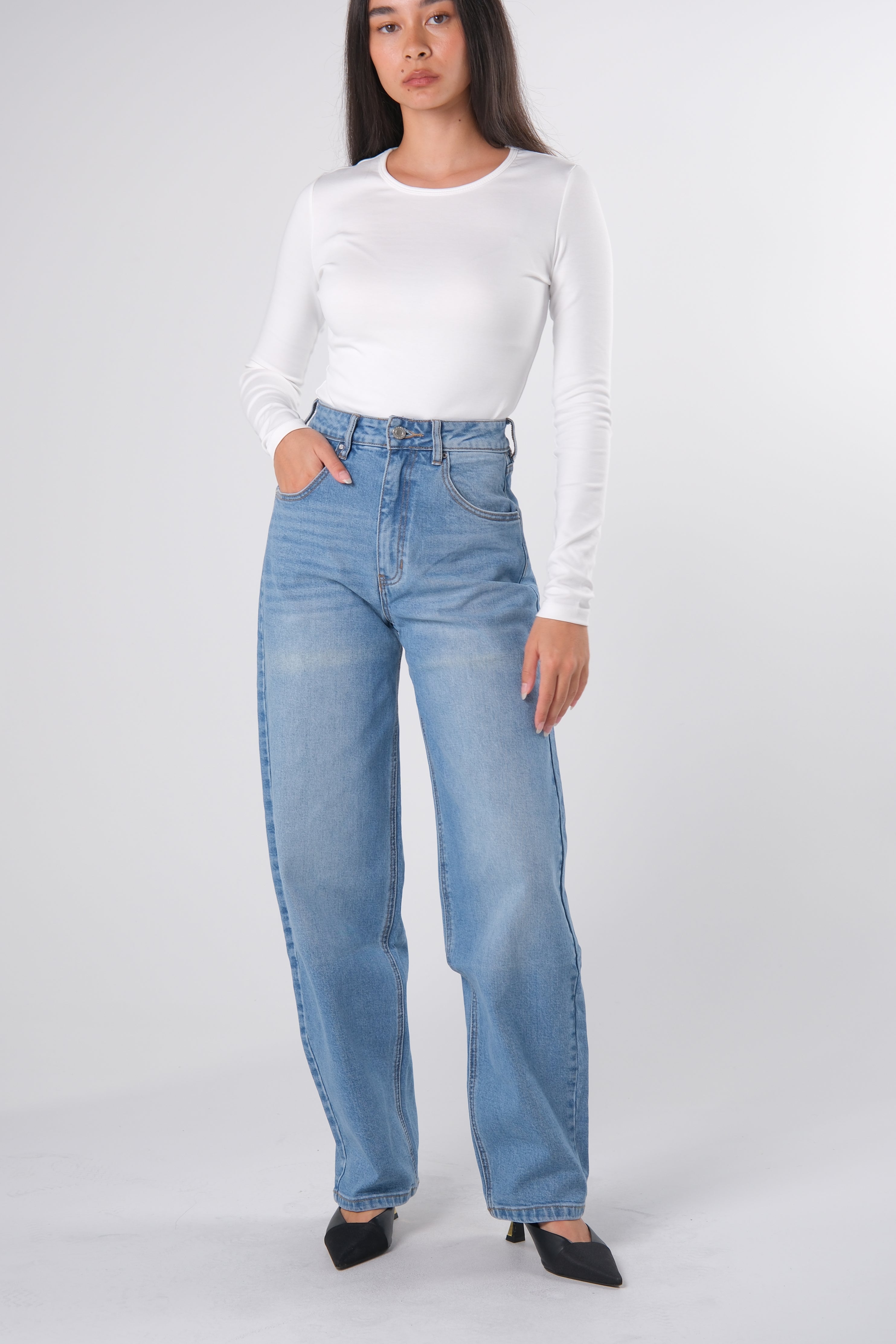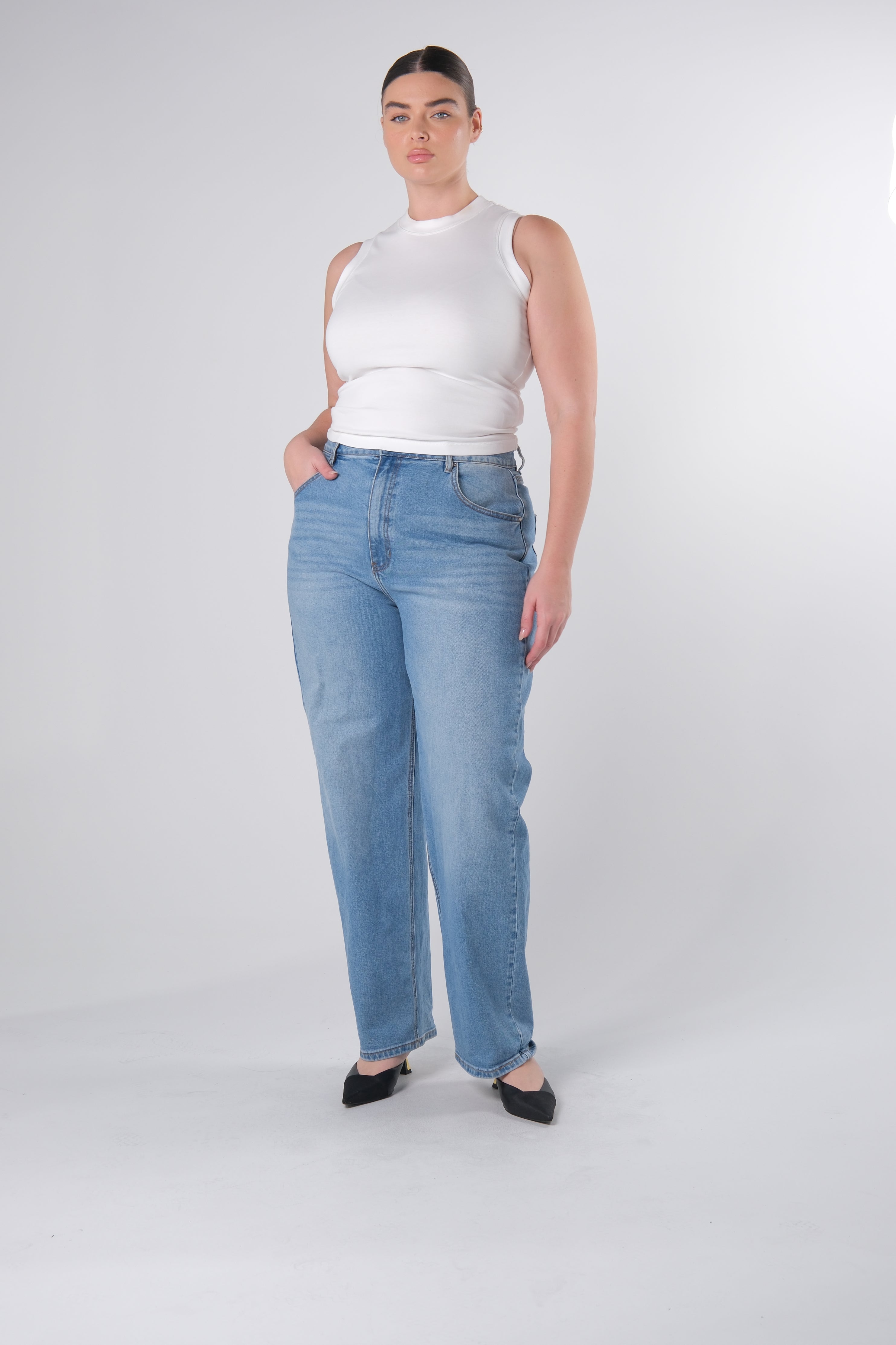 Designed to sit at mid-to-high hip, these jeans offer a snug waist and extra roomy leg for ultimate comfort. Available in medium blue wash, the baggy fit and classic details create a versatile look. For a low to mid-rise fit, size up.