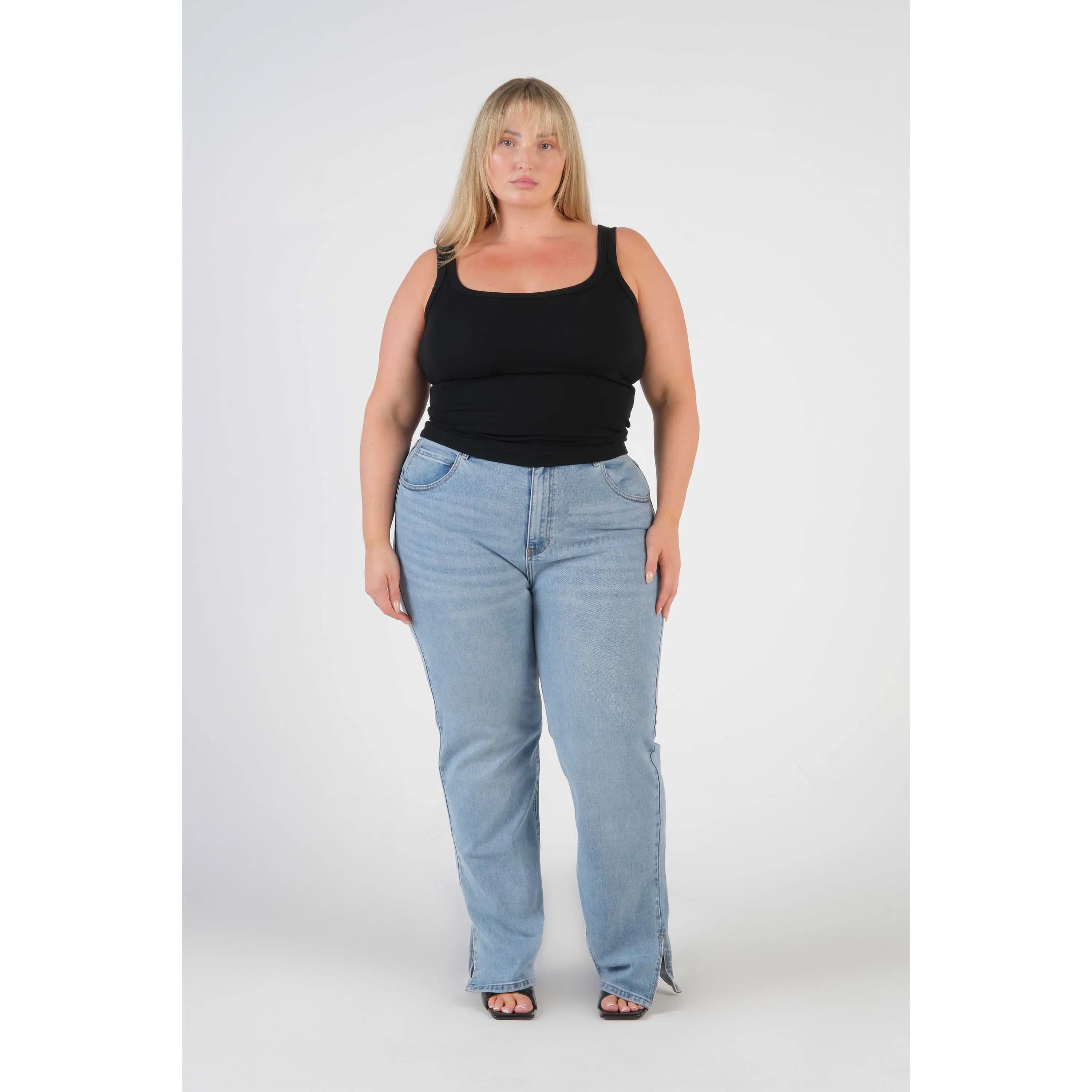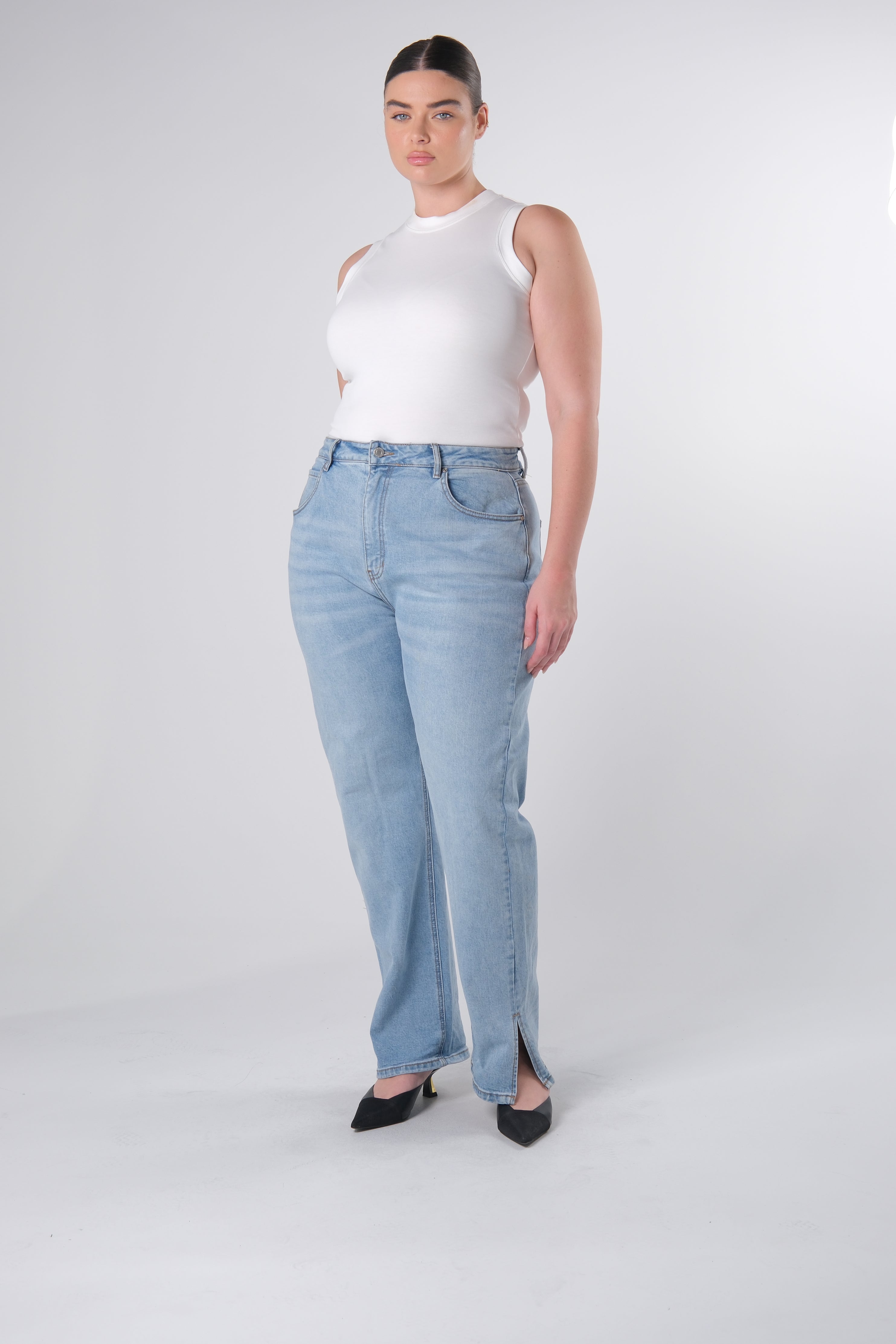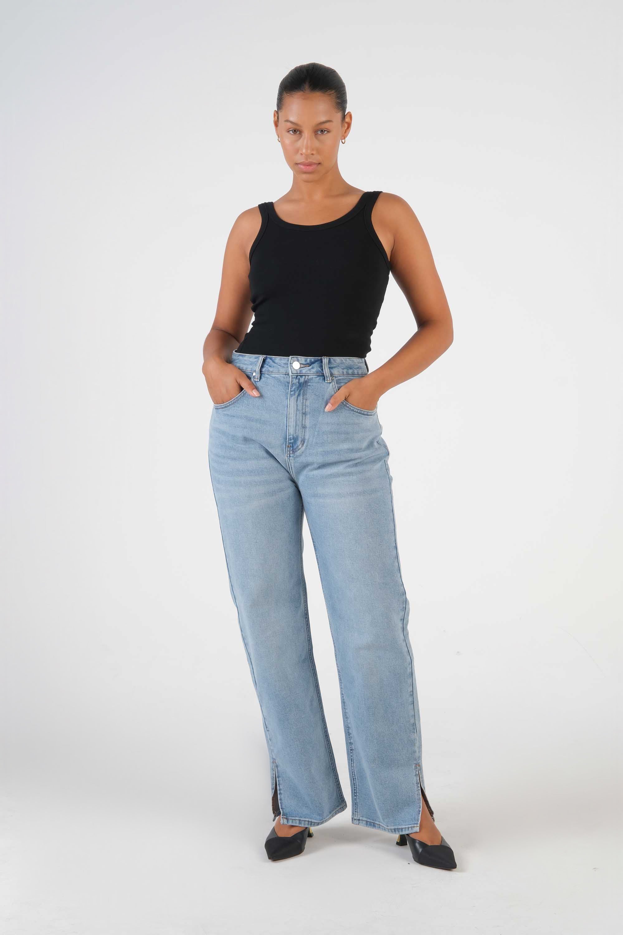 Designed to sit at the high hip and accentuate the waist, our straight leg jean in medium blue wash offers a flattering fit. Classic details and side splits at the hem add a chic touch. Pair with a tailored top for an elegant ensemble.